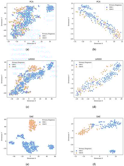 Visualization of extracted features from gene biomarkers for primary diagnosis prognosis: (a) train data extracted by PCA, (b) test data extracted by PCA, (c) train data extracted by LASSO, (d) test data extracted by LASSO, (e) train data extracted by DAE, (f) test data extracted by DAE.