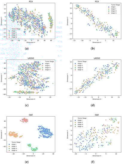 Visualization of extracted features from gene biomarkers for tumor stage prognosis: (a) train data extracted by PCA, (b) test data extracted by PCA, (c) train data extracted by LASSO, (d) test data extracted by LASSO, (e) train data extracted by DAE, (f) test data extracted by DAE.