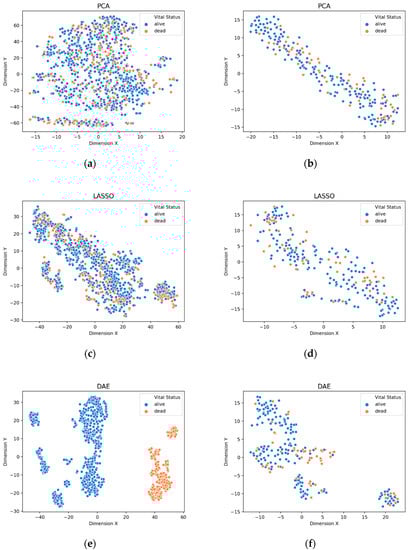 Visualization of extracted features from gene biomarkers for vital status prognosis: (a) train data extracted by PCA, (b) test data extracted by PCA, (c) train data extracted by LASSO, (d) test data extracted by LASSO, (e) train data extracted by DAE, (f) test data extracted by DAE.