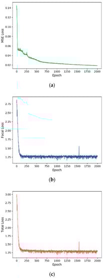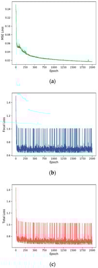Training loss for sample type prognosis: (a) MSE loss, (b) focal loss, (c) total loss. The x axis indicates the number of epochs, and the y axis indicates the loss.