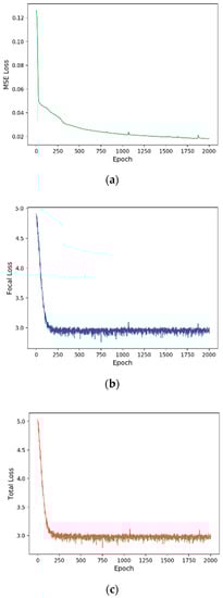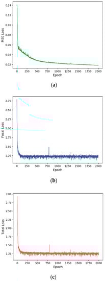 where  and  are the number of true positives, true negatives, false positives, and false negatives, respectively. A true positive is an outcome where the model correctly predicts the positive class. Similarly, a true negative is an outcome where the model correctly predicts the negative class. A false positive is an outcome where the model incorrectly predicts the positive class, and a false negative is an outcome where the model incorrectly predicts the negative class. In Table 5, we compared the models with different loss functions (only MSE loss, only focal loss, and total loss). It can be seen that the models with total loss show better performances than the other single loss models, and the models with only MSE loss show the worst results.