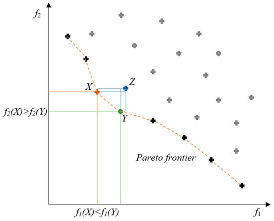The upper and lower bounds for the optimization functions of Pareto optimal solutions are defined by the ideal and nadir vector components. An example of Pareto optimal solutions is shown in Figure 1, where there are two optimization functions, f1 and f2. The points in the coordinate system represent possible Pareto solutions where the point Z is not defined as the Pareto optimal solution, because it is dominated by the X and Y points. The points X and Y are not dominated by each other, so we can define both as Pareto optimal solutions.