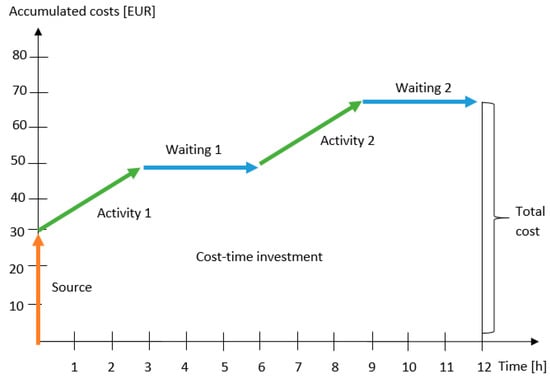 - Waiting: It is defined as the sum of moments during which no activity occurs. It is assumed that, while waiting for the implementation of the activity, its costs do not increase. The fact that waiting costs do not increase in this activity is presented in the CTP as a horizontal line. Activity waiting periods are very important, because it is widely known that there is a considerable amount of time during which there is no added value to production processes. This time does not affect the cost of the order directly, but extends the time before the order is shipped.