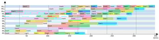 The production system input data shown in Table 9 and the order input data, performs multi-criteria optimization of custom production scheduling using the IHKA algorithm [26]. In Figure 4, the Gantt chart provides a solution for scheduling orders and individual operations according to the machines available. The IHKA optimization algorithm performed the optimization with three key parameters: makespan, total machine utilization and utilization of the most busy (bottleneck elimination). The Gantt chart in Figure 4 shows that all orders are executed within 348 min. In order to determine the performance of the IHKA algorithm in solving real-world optimization problems, an analysis and comparison of optimization results was performed, with the currently most up-to-date algorithms for solving the flexible manufacturing scheduling of MOPSO and BBMOPSO.