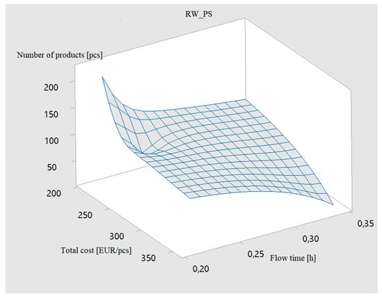 Table 6 and Table 7 define the number of products per order. The number of order products ranges from the value of one product in the reference scenario Rs, to 20 pieces of the product per single order in the scenario S2. The introduction of the simulation scenario method represents the possibility of testing and responding the simulation model to different changes in the production system. In our case, the three simulation scenarios define manufacturing flexibility as, fully customizable production in the RS scenario, where each order represents one piece of product. By increasing the number of products within the order in scenario S1 (1 to 10 pieces) and S2 (10 to 20 pieces), here, the production is defined as less flexible. The number of product pieces in Table 5, Table 6 and Table 7 is represented by label Pq. The Pq values are assigned numerically according to the distribution function and the interdependence of the production parameters. The simulation scenarios designed in this way allow us to analyze the impact of manufacturing flexibility on the cost-time profile diagram.
