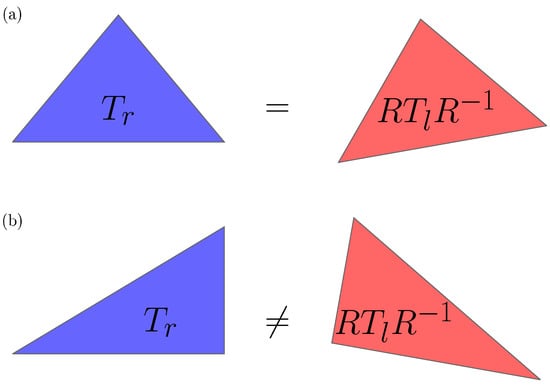 (a) The mirror image of an achiral object overlaps with its original after proper translations and rotations. This implies that the original T-matrix coincides with of the mirror object after the corresponding transformations R. (b) A chiral object and its mirror image are not congruent. If the object is much smaller than the incident wavelength, it usually exists a transformation R after which and are equal. Note that the achiral isosceles triangle in (a) possess a mirror plane in 2D and that the asymmetric triangle in (b) is chiral only in 2D.