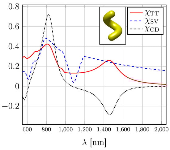 In Figure 2, we compare simulations of the aforementioned three coefficients quantifying the e.m. chirality for a gold helix as realized experimentally [24]. The helix is constructed on the surface of a cylinder with height 230nm and radius 60nm (see Supplementary Materials). The CD spectrum shows zero values at incident wavelengths of and . If only these wavelengths were analyzed, one could draw the conclusion that an achiral object is investigated. This contradicts the goal of this study to obtain insights into illumination-independent symmetries of the scatterer—for illuminations with and , the scatterer seems to be geometrically achiral which is obviously not the case. Nevertheless, CD makes the chiral geometric nature of the helix visible as a maximum at and a minimum at of smaller amplitude. For a helix with an opposite twist—that is, the mirror image—the roles of the extrema are interchanged.