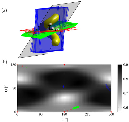 Alongside the geometric coefficient , the planes identified for the minimized T-matrix difference are shown as colored circles in Figure 3b. The colors (red, blue and green) of these circles are the same colors used for the planes, that is, a direct comparison of the angle parameters is possible. As seen, the planes are ranked according to their values: The perpendicular class 1 (blue) has The flat planes belonging to class 2 (red) show and and the tilted class 3 (green) has and .