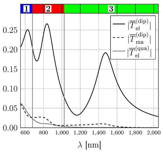 The analysis in Figure 3b suggests that class 3 (green) is the closest one to the geometric mirror plane. This is further strengthened by the full angular spectrum of the optical chirality coefficient (see Supplementary Materials). Accordingly, we find that the optical response is dominated by the geometric shape for long wavelengths. Obviously, the optics is dominated by the electric dipole moment in this regime which is also shown in Figure 4. Here, the mean of the diagonal entries of submatrices of the T-matrix are shown. These are proportional to the electric and magnetic dipole moments as well as to the electric quadrupole moments.
