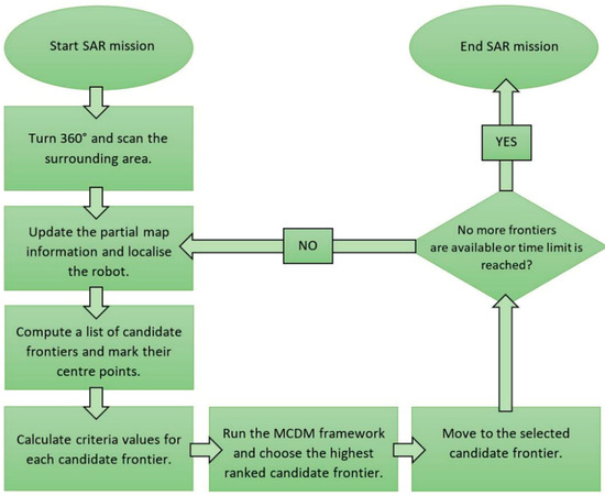 Considering the research field of robotics and autonomous robots, MCDM frameworks have also been the focus of some decision-making related studies, for example, selection method of automatically guided vehicles for warehouse automation was proposed in [32]. Ghorabaee [33] proposed a method for industrial robot selection. A similar industrial robot selection problem has also been addressed in [34]. However, these papers focus on the robot selection problem and not the actual environment exploration by autonomous mobile robots. Autonomous search and rescue missions by MCDM-driven decision-making module has first been introduced by Amigoni and Basilico [35]. Following this research, a PROMETHEE II method was proposed in [36] to improve the robot decision-making ability, and a recent study by Bausys et al. [23] introduced WASPAS extension by single-valued neutrosophic sets, directed to incorporate sustainability principles in autonomous environment exploration by mobile robots.