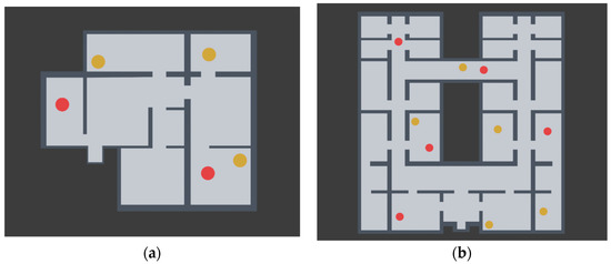 To assess the proposed WASPAS-IVNS framework in search and rescue missions, two indoor environments representing commercial-type and public-type buildings were considered. In the commercial-type building environments (e.g., retail shops), rooms and staff-only areas are relatively small and are commonly connected to each other by the central hall. This type of structure requires the robot to constantly backtrack to previous locations in order to visit new ones. Differently, public-type buildings, such as hospitals, are distinguished by wide open spaces and looping corridors, enabling the robot to observe more environment and detect dangerous OOIs in advance. Both of these environments are presented in Figure 2.