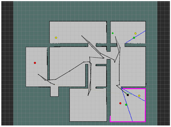 To highlight the practical application of the proposed WASPAS-IVNS framework, an example solution to one of the autonomous robot decision-making iterations is provided. The public-type building environment information, as mapped by the robot at the considered candidate frontier selection iteration, is provided in Figure 3. One victim and one dangerous object have already been found by the robot and marked by yellow and red dots, respectively. The robot is located at the position marked by a black dot, and the black line represents its previous movement trajectory. The available frontier regions are coloured in blue, and the green dots represent candidate frontier centre points that robot decision-making module must evaluate. At this iteration, the robot has a total of seven candidate frontiers to choose from.