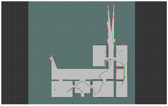 Differently from the commercial-type building environments, in a public-type building environment, the robot was not able to complete an exhaustive environment exploration, due to the set time restrictions. These results are to be expected when applying the proposed environment exploration strategy, especially when considering the criterion, denoting the distance from the candidate frontier location to the robot control centre. The criterion is minimised, to ensure that the robot will be able to transfer the obtained information after reaching the candidate frontier. Therefore, at the start of the search and rescue mission, the robot spends a lot of time analysing nearby locations, as presented by the robot movement trajectory in one of the test runs, depicted in Figure 7.