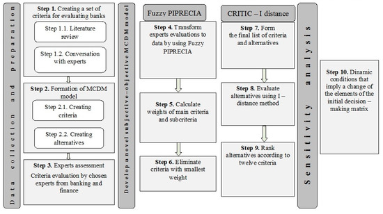 Creating a subjective-objective model for multi-criteria ranking of the alternatives required certain activities divided into three phases. Each phase involved a number of steps, and their importance was equally essential for the proper formation of the model. The initial phase, which related to data collection and preparation, as a first step involved the acquaintance with the most important literature and achievements in the field of MCDM. As part of that step, it was necessary to address all the significant studies conducted in the field of ranking business entities so far, and thus banks too. Since the model entailed consulting experts in one of its segments and accepting their preferences regarding various aspects (criteria) of bank performance, the second step involved careful selection of the criteria and consulting in relation to the selection of criteria and sub-criteria. The selection of criteria and alternatives was the following step, and within it, the angles from which the quality of a business entity would be viewed were determined. As banks represent one of the most important segments of both society and economy, and as bearers of stable and sustainable economic growth, they have been selected as alternatives in this MCDM model. The last step in that phase required the selected experts to evaluate the criteria and sub-criteria on the basis of their preferences, in order to further determine the significance of each of them individually.