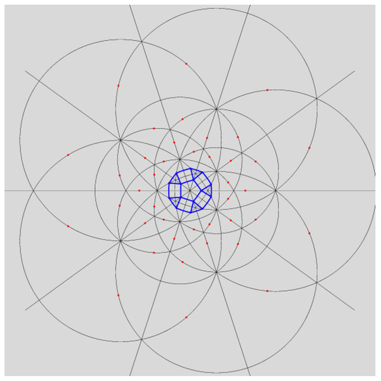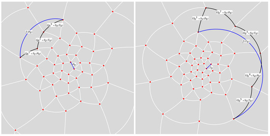 Referring to the graphical results, the second-generation system of edges appears in white. (Note the change in usage: here, refers to an approximation of the actual system of edges.) Gaps around the critical points are due to the large expansion under the pullback. Given a point on an edge, we pull back to by solving . In the plot on the left side, the gray curves correspond to the inverse image . The pulled-back edges reveal the beginnings of a fractal structure: within each face A, there is a collection of “pre-faces” that indicates what face-types covers. Note that is close to being a subset of —visual evidence that is approximately f-invariant.