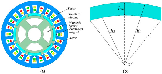 As the core component of electric vehicle, the performance of the driving motor directly affects the performance of electric vehicles. The research and development of high-performance electric vehicle drive motors has become one of the important factors restricting the development of electric vehicles [2]. The main types of drive motors for electric vehicles are brushless DC motors, induction motors, switched reluctance motors and permanent magnet synchronous motors (PMSM). The PMSM has a series of advantages, such as a simple structure, high efficiency and excellent performance of flux-weakening speed expansion—making it more and more widely used as an electric vehicle drive motor in recent years [3]. However, for PMSM, the magnetic energy generated by the permanent magnet will interact with the stator slot, which will produce the slot effect, increase the harmonic content in the air gap, and reduce the control accuracy of the drive system. Therefore, reducing the cogging torque and improving the performance of flux-weakening speed expansion are the important research contents of PMSM for electric vehicles.