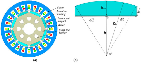 Schematic diagram of the novel SIPMSM and unequal thickness magnetic poles. (a) Schematic diagram of the novel SIPMSM; (b) Schematic diagram of unequal thickness magnetic poles.