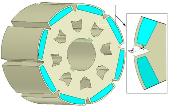The shape of magnetic pole effects the output characteristics of PMSM directly. The permanent magnet of typical SIPMSM is a tile shape with inner and outer arc centers at the same point—as shown in Figure 1. A PMSM with this kind of magnetic pole usually has the disadvantages of large cogging torque, large leakage and poor flux weakening capability [16]. Therefore, a novel SIPMSM is developed, as shown in Figure 2. The permanent magnet in the novel SIPMSM is an unequal thickness magnetic pole with different inner and outer radians, which results in the uneven distribution of the radial air-gap flux density and remarkable magnetic congregate effect. In order to reduce the leakage flux and the high harmonic content in the air-gap, an auxiliary slot is notched in the rotor, as shown in Figure 3.