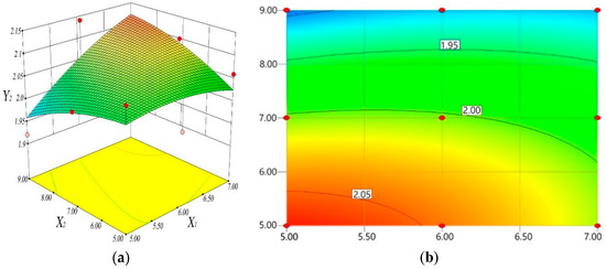 Effect of interaction factors on peak value of cogging torque Y2: (a) 3D and (b) 2D contours.