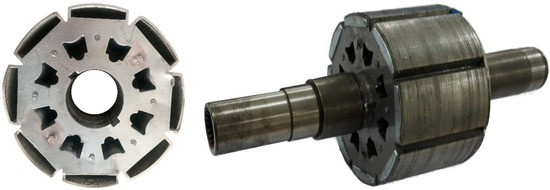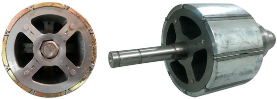 In order to verify the correctness of the optimization design and the superiority of the novel SIPMSM. In this paper, two SIPMSMs with the same-rated parameters were trial-produced, as shown in Figure 6 and Figure 7. The optimum design structures of traditional SIPMSM and the novel SIPMSM were tested and verified, and the performance of the test results was compared. The structure of the stator, winding layout, outer diameter of rotor, volume of permanent magnet and pole arc coefficient of the two motors are the same—the main difference between the two motors is that the maximum thickness of the rotor pole and slotting structure are different.