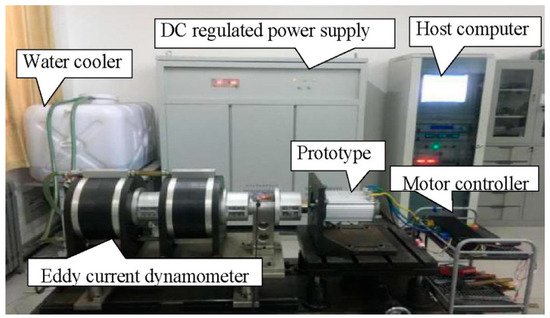 The two prototypes were tested on the eddy current dynamometer, as shown in Figure 8. With the increase in the motor speed, the load increases continuously, so that the motor current reaches the limit value. Then the sensor detects and collects signals. Finally, the output characteristic curve and efficiency map of the two SIPMSMs are shown in Figure 9 and Figure 10.