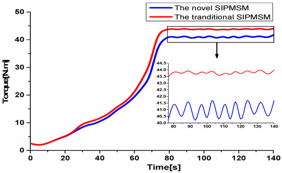 From Figure 11, it can be seen that the output torque of the two SIPMSMs reaches a stable state at 77 s, owing to the same control mode and rated parameters. However, the output torque of the novel SIPMSM is clearly higher than the traditional SIPMSM. This is because the reasonable design of the permanent magnets with unequal thickness makes the air-gap magnetic field have a significant magnetic congregate effect and enhances the output torque. It is not difficult to see that the torque ripple of the novel SIPMSM is lower than the traditional SIPMSM when it reaches steady state.