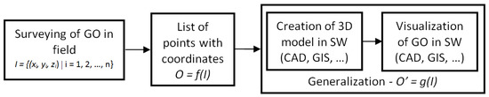 The process of creating a 3D model of a geographic object (GO) is simplified according to the diagram presented in Figure 1. The GO can represent any real object of interest (e.g., building or other construction). A general and not yet fully solved problem is to create a 3D model in suitable software (SW) with given accuracy.