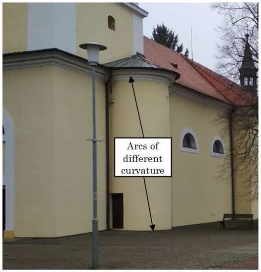 Geometric inaccuracy became evident when transforming the measured points from the terrain into suitable software (AUTOCAD) in several details. Of all cases, we will show as a demonstration example in Figure 3 and Figure 4 during the 3D model creation of church of St. Jonh the Baptist and John the Apostle in Brno-Bystrc district (CR). Figure 3 shows a detail of the rotunda with the upper and lower arches indicated. Both arcs actually have different radii of curvature. When creating a wireframe, it was not possible to connect these arcs with vertical edges in AUTOCAD. The connection of the same edge to the lower arc was disconnected and vice versa when joining an edge to the upper arc. It was necessary to generalize the model in order to connect both arcs with vertical edges. The result after generalization is evident in Figure 4. The disadvantage is that similar inaccuracies limit the further practical use of the 3D model, e.g., making sections for the purpose of object reconstruction etc.