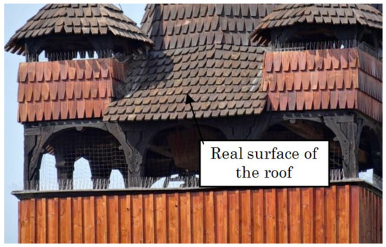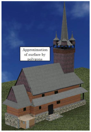 Problems with visualization are demonstrated on the 3D model of the Church of St. Paraskiva in Blansko (CR). In general, it involves laying textures or patterns with the real appearance of the building material used (e.g., roof tiles or shingles) on 3D model surfaces. In existing programs, this is only possible when the surfaces are planar. However, for real objects, the surfaces of buildings rarely meet that requirement. Most of these are general areas in space—see Figure 5. In this case, it is very difficult to apply realistic textures to these surfaces. Usually, it is necessary to decompose the surface into a numerous of planar patterns and then cover them with textures or photographs. Usually, triangles or planar quadrilaterals are used. However, this process is very time-consuming and laborious and in many cases the result does not correspond to the exerted effort. Figure 5 and Figure 6 show the difference.