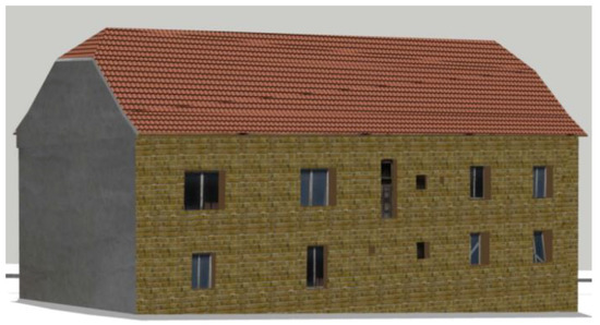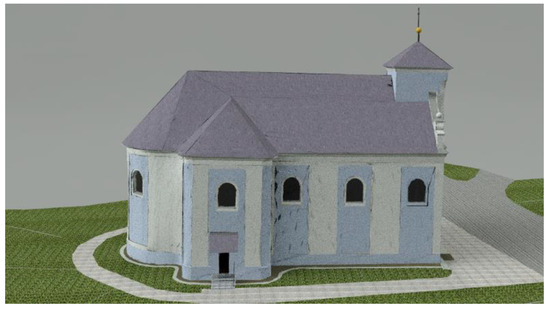 A similar situation can be seen in the models Strejc Church in Židlochovice—Figure 7 and Figure 8—and the Church of St. Peter of Alcantara in Karviná (CZE)—Figure 9 and Figure 10. The visualization of the Strejc Church (Figure 8) was done while using standard tools in the AUTOCAD program. The difference between the actual situation (Figure 7) and the display in AutoCAD (Figure 8) of the two images is obvious. For another 3D model of the Church of St. Peter of Alcantara in Karviná—Figure 9 and Figure 10—visualization was performed while using own set of textures. The result is evident from the comparison of Figure 9 and Figure 10. The visualization quality of the 3D model is many times higher than that of the Strejc’s Church (Figure 7 and Figure 8). However, the bases of both visualizations are the same—the textures in both models were placed on generalized (planar) surfaces. If we left the model without generalization, one of the methods described in [24] or [25] would have to be used for visualization.
