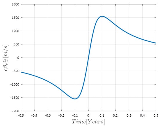 To understand the contribution of each factor to the difference in predictions and to identify the time when the difference is maximal, we calculated these differences by simulating the motion of the SO-2 star. For the simulation, was calculated by use of (22), with the mass of Srg *, as given in []. We found on the trajectory by solving Equation (41) numerically and using the known initial conditions for SO-2. Then we found by solving (46). From this, we obtained . Next, we used Equations (46) and (41) to calculate and , respectively. Finally, we calculated and , expressing the difference between the relativistic redshift due to time dilation predicted by and .