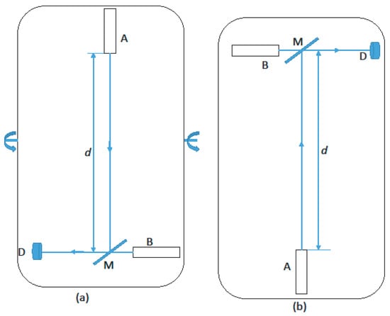 We propose the following experimental set-up. Two short-wavelength, high-coherence lasers, A and B, of the same frequency are placed perpendicularly, as shown in Figure 3. The two beams are combined by a semitransparent mirror M. The interference of the two beams is measured by a detector D. The whole system may be rotated so that in state (a) the beam from A propagates downward a distance d, while in state (b) it propagates the same distance upward. If the speed of light in both directions is the same, the phase shift between the beams from A and B on the path from M to D should be the same for both states, implying the same intensity on the detector. However, if these speeds are different, states (a) and (b) will have different phase shifts, as well as different intensities at the detector.