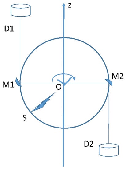 The radiation from a point source S outside a rotating disc is split into two rays. One is sent left and reflected upward by a mirror M1, attached to the rotating disc, and detected by D1. The second ray is sent right and reflected downward by a mirror M2, attached to the same disc, and detected by D2. The redshift observed on the detectors is . If the model is true, both detectors should measure the same shift. However, predicts different shifts. As the velocity of the source—mirror M1 for the radiation reaching D1—is in the radial direction of the field, . For the radiation reaching D2, however, the velocity of M2 is in the opposite direction and . Thus, from (33), there will be a difference between the radiation frequencies observed by the two detectors. The frequency difference corresponds to a Doppler shift with velocity . On the Earth’s surface, . The expected shift is , which could be measured by high accuracy interference between the two beams.