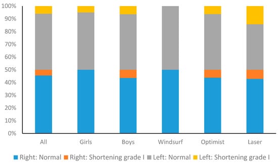 The results obtained in the SLL test for the right and left leg indicate that, in the total sample of sailors, only 9% had grade I shortening in the right leg and 12% in the left leg (Figure 1). This shortening is present in the group of boys and with a percentage of 12% in both legs. In the different classes evaluated in the study, we observed that 100% of the sailors of the Windsurfing class had normal flexibility in both legs, while in the Laser class 28.6% had grade I shortening in the right leg and 14.3% in the left leg, with this class being the one with the greatest number of sailors with shortening. In the Optimist class, only 12.5% and 12.6% had grade I shortening in the right and left leg, respectively.