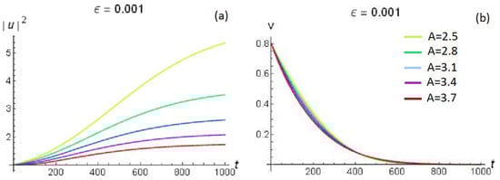 (a) Amplitude and (b) velocity of the soliton versus different A for .