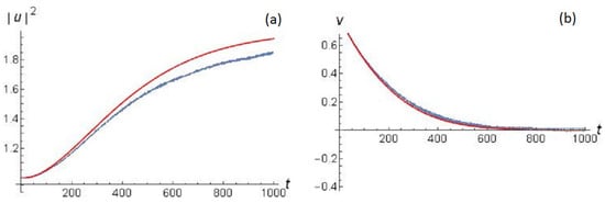 Evolution of soliton amplitude (a) and velocity (b) with time. Comparison of perturbation theory (red solid line) with numerical solution (blue dot line) for . Parameters of initial soliton are and dissipative parameters are .