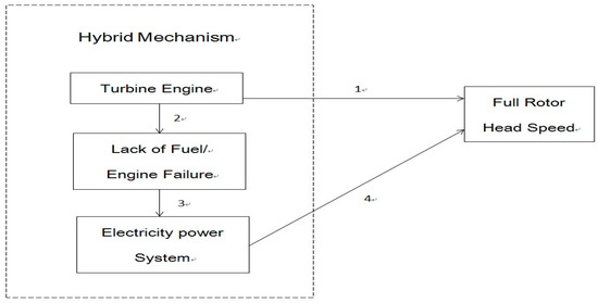Figure 2 explains the sequence for the operation procedure of the proposed hybrid mechanism. Generally speaking, (1) A turbine engine offers the power for rotor head speed; (2) if the turbine engine suffers from lack of fuel/engine failure, (3) the electricity power system offers auxiliary dominance so as to (4) keep the full rotor head speed for a helicopter.