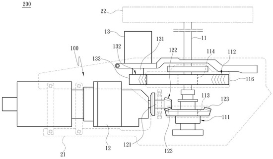 Operationally, once we start the turbine engine (12), this engine rotates the first output shaft (121) and the first bevel driving gear (122) so as to drive first bevel gear (123). Consequently, through the first transmission gear (111), the one-way bearing module (113) is driven to turn the driver shaft for the propellers (11). Finally, the propellers (22) revolve at a specified speed so as to provide sufficient thrust for lifting the remote control helicopter. In more specific terms, we set the turbine engine’s (12) output shaft rpm to 9000; the gear ratio between the first bevel driving gear (122) and the first bevel gear (123) was 1:4. Accordingly, the rpm of driver shaft for propellers (11) was 2250. However, the realistic rpm reaches only 70–80% (1575–1800) of the calculated result due to aerodynamic drag [13,14].