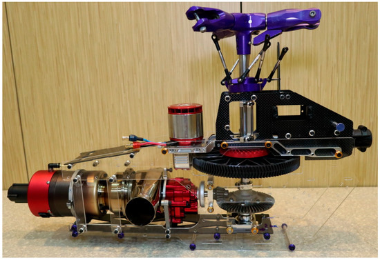 - 3.1. MD-8 remote control helicopter: We decided to choose the MD-8 as the model for our test because this helicopter has great reputation in the R/C industry due to its agility, rigidity, and simplicity for maintenance. The dimensions for this remote control helicopter are 230 (L) × 30 (W) × 55 cm (H). Further, we also needed to design and build a conversion kit which contained new reinforced helicopter body frames so as to accommodate both a complete turbine engine device and an electricity power system. This conversion kit was made by composite materials of carbon-fiberglass and aluminum-alloy poles with the dimensions of 50 (L) × 15 (W) × 30 cm (H). The turbine engine was installed in this kit via a set of custom-made engine mount and gear box mount.