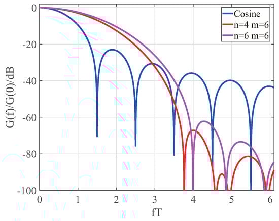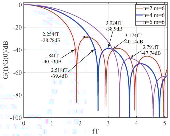 Obviously, the energy ratio of the main energy spectrum of the normalized spectrum improved by adding the additional conditions in the frequency-domain. The magnitude of this value can also be used as a criterion for measuring the nature of the spectrum. In addition, under the frequency-domain restriction, the optimization restriction is made according to the signal in the frequency-domain that has not been normalized. The figures show the energy spectrum density obtained after normalization, together with the effect of the two frequency-domain restriction conditions. Therefore, the obtained normalized energy spectrum density does not completely coincide with the requirements of the restriction conditions. For example, at n = 4, m = 6, the normalized energy spectral density at a frequency of 2.518 fT is −21 dB and does not completely coincide with the limited −20 dB.