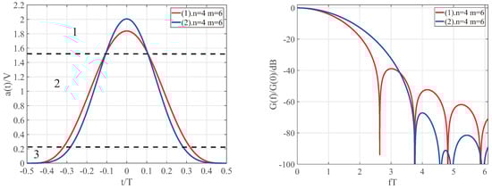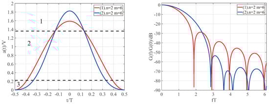 The corresponding time-domain signals and their normalized energy spectrum density can be obtained from Equations (17) and (18), as shown in Figure 2, where line (1) represents the signal when there is only energy and boundary limitations, and line (2) represents the signal under the additional frequency-domain limitations.