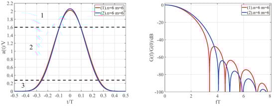 For the same value of roll-off factor n and different m values, the frequency-domain main lobe energy ratio of the signal under different constraints and the spectral bandwidth calculated by −40 dB and −60 dB are compared and analyzed at n = 2, and m = 5, 6, and 7. The relevant data obtained in the absence and presence of the frequency-domain restriction condition are shown in Table 5 and Table 6, respectively.