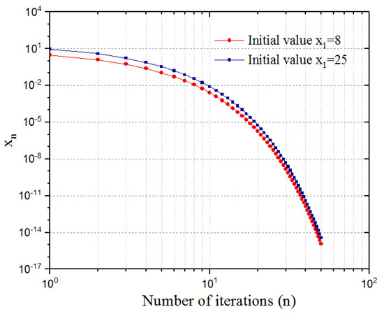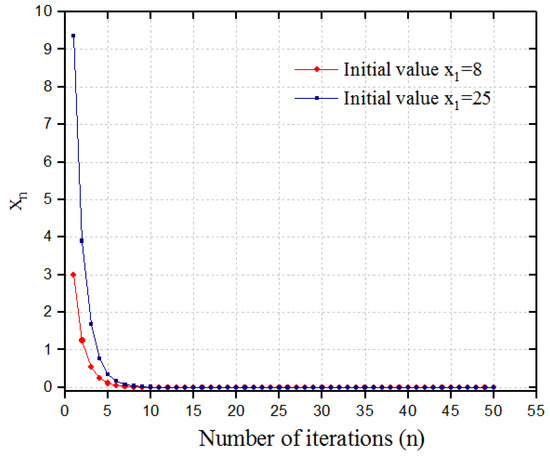 First of all, the parameters in Example 1 satisfy the conditions (i)–() in Theorem 1, which shows that the coefficients in our Theorem 1 are obtained. From Figure 1, we can see the convergence value of the iterative sequence when the initial values are and , respectively. From Figure 2, we can observe the convergence speed of the iterative algorithm. Figure 1 and Figure 2 show that converges strongly to 0, where . The convergence of in Example 1 shows the implementation and efficiency of our proposed algorithm.