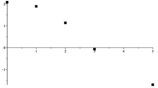 Dependence of the -term (arbitrary units): see (47) on the discrete set of the additional conditions . Each point relates to the specific curve in Figure 1. The cosmological constant varies from negative to positive values. At the same time, their set has the cardinality of the continuum. Therefore, we sure can find such additional conditions for which the -term is arbitrary close to zero.