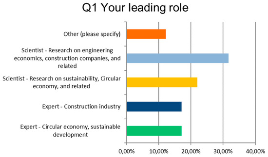 The largest number of respondents (31.71%) were scientists involved in research on engineering economics, construction companies and related matters, followed by scientists of sustainability, circular economy and related areas (21.95%), experts of circular economy, sustainable development and construction industry (17.07% for each group), and others—five people related to the construction industry or CE but not considered as experts were a minority of the sample (12.20%), as shown in Figure 1.