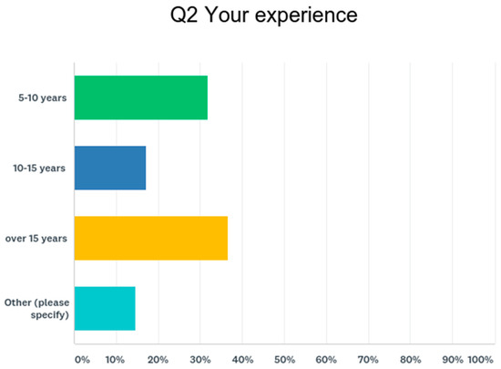 Analyzing a professional practice of respondents (Figure 3), the largest was a group with over 15 years of experience (36.59%), then 5–10 years (31.71%), and the smallest had less than five years of professional experience.