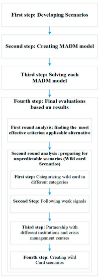 A foresight comprehensive plan can be completely different in future scenarios. In a foresight strategic policy, pre-planning is considered in all possible scenarios. It can be inferred that future scenarios are similar in most components, although some differences exist among the criteria, alternatives, and relative importance. A final analysis is structured respecting all scenarios and MADM models based on the scenarios. It can be deduced that MADM-based scenarios form a multi-disciplinary perspective comprised of two multi-disciplinary fields, which are futures studies and multiple criteria decision making (MCDM) as a sub-field of Decision Science. The process of the MADM-based scenarios’ concept is illustrated in Figure 1.