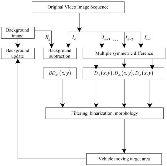 The flow chart of autonomous detection for the traffic flow parameter based on the fusion of multiple symmetric differences and background subtraction target extraction is shown in Figure 2.