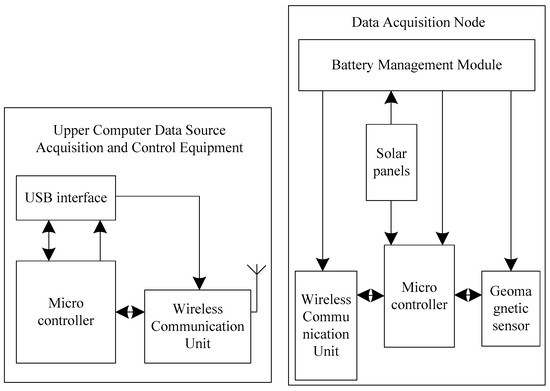 The hardware structure of the method contained the wireless sensor node and the data acquisition and control equipment of a host computer. The wireless sensor node included the sensor data acquisition unit, the wireless communication unit, and the power supply unit. The data acquisition and control equipment of host computer included the microcontroller, the wireless communication unit, and the USB (Universal Serial BUS) interface. The multi in-car sensing equipment sensor was designed by the data acquisition unit. It was set on the roadside or vehicle body to collect traffic flow parameters, which were then transmitted to the data acquisition and control equipment of the host computer through the wireless communication unit, in which the power supply unit was mainly responsible for the power supply. The host computer data acquisition control method received the traffic flow detection data through the wireless communication unit and then obtained the details of the moving objects in the traffic flow by the traffic flow detection method based on symmetrical difference. The overall architecture of the method of autonomous detection for the traffic flow parameter of the in-vehicle sensing equipment based on symmetrical difference is shown in Figure 3.
