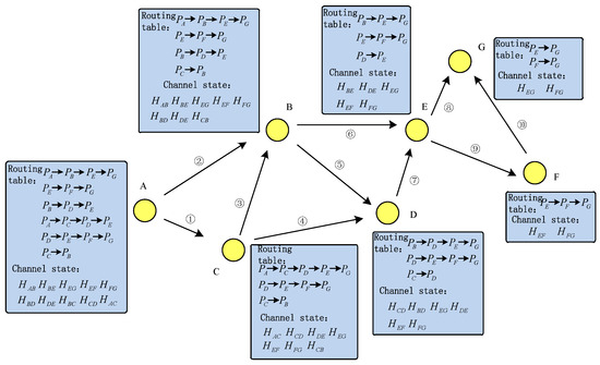 The routing process of the cross-layer pre-equalization method is shown in Figure 4. In the process of establishing and updating the route based on geographical location, the nodes were strictly limited to obtain the geographic location information of nodes that were not related to them, but the wiretap nodes were unable to use the channel state of the overall route for information restoration so that the safety of information transmission could be ensured. The route information stored from node A to node G was reduced in turn, and the information that the back-end node had nothing to do with the current node that was reduced, so that it was able to interfere with the illegal data during the information transmission and improve the transmission security of information at the physical layer [16,17,18].
